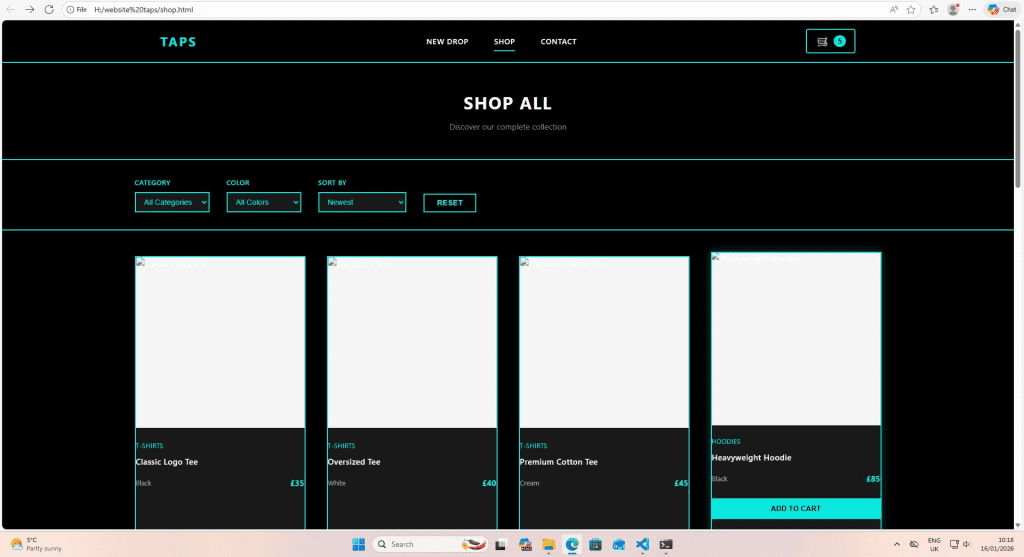 We kicked things off with some web development work, building out an e-commerce clothing site called “TAPS” in Visual Studio Code. The focus was on HTML structure and CSS styling, and by the end of the session, we’d completely overhauled the colour scheme, swapping out grey accents for a sleek cyan theme that really makes the design pop. Working across multiple files, we updated navigation elements, product cards, buttons, and the overall site styling while keeping the cart functionality intact. It’s shaping up to be a genuinely professional-looking storefront.