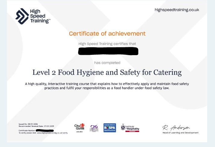 Huge congratulations to PH who completed his Level 2 Food Hygiene certificate.